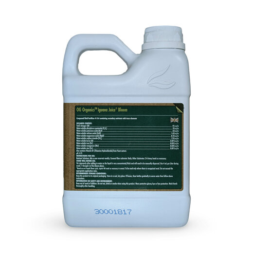 - В состав Iguana Juice Organic Bloom входят такие ингредиенты как экстракт юкки, останки рыб, экстракт криля, биогумус, вулканический пепел, ламинария, экстракт люцерны. Эти компоненты содержат питательные вещества в натуральной форме, повышая устойчивость растения в борьбе с паразитами и заболеваниями, а также производство смол и эфирных масел в растении.
